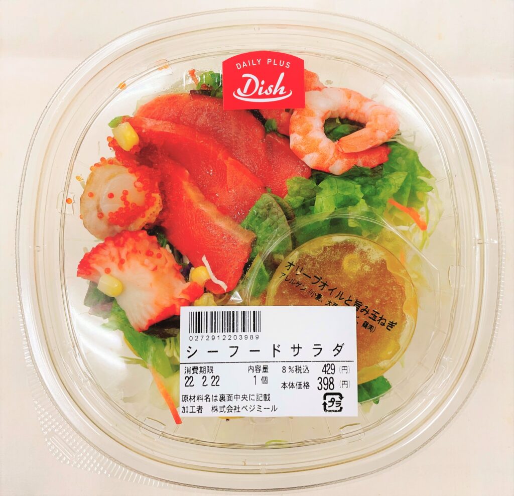 エビ・ホタテ・サーモンなどが入ったシーフードサラダです。